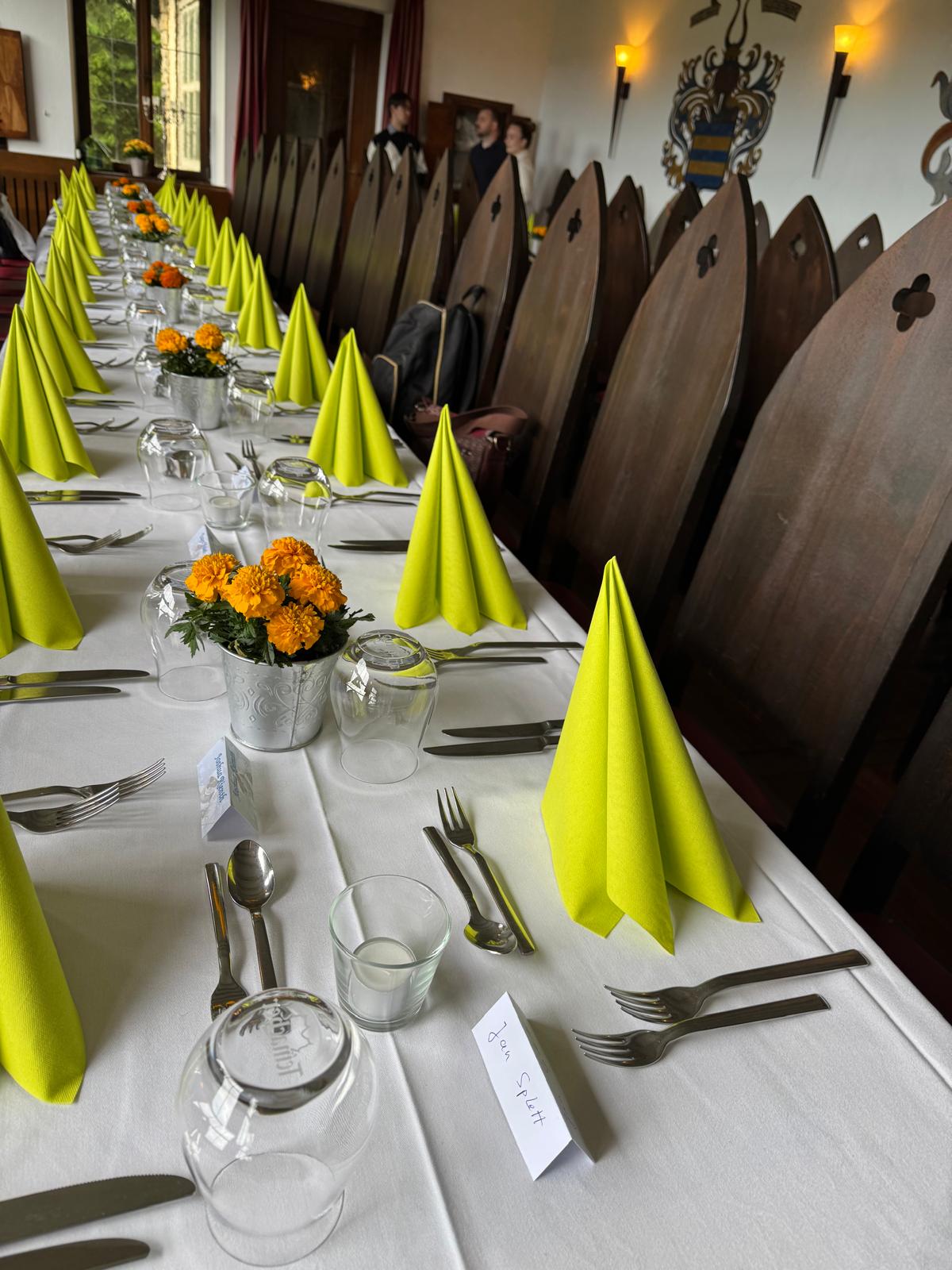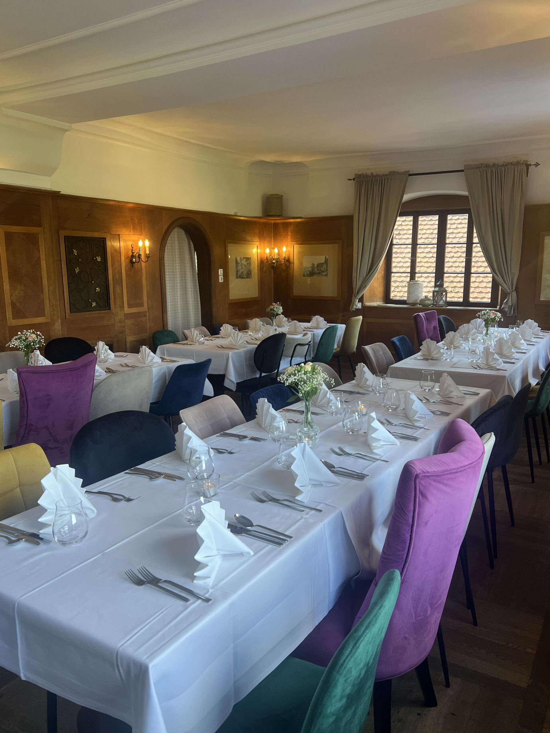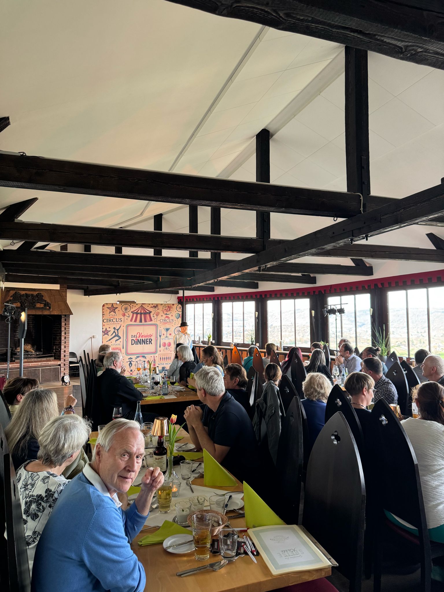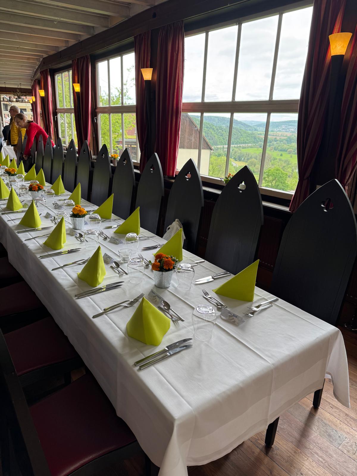 Ein Offener Kamin und der Panoramablick über das Neckartal machen den Raum einzigartig. Mit Zugang zur privaten Terrasse! Überzeugen Sie sich selbst! Von 70 bis 150 Gäste. Block- / Bankett-Tische bis 130 Personen und Tanzfläche!